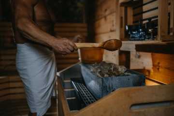 Finská sauna s panoramatickým výhledem na jezero láká především pro tichou relaxaci na kraji lesa. V prostorné saunové kabině ze světlého dřeva vám saunování zpříjemní mentolové krystaly a dekorace ve formě loukoťových kol, větviček, šišek a čerstvého voňavého dříví z nedalekého lesa.