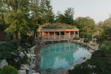 Přírodní koupací jezírko s čistou, filtrovanou vodou slouží ke zchlazení rozehřátého těla po saunování. Před vstupem do jezírka je nezbytné se osprchovat. Teplota vody se mění v závislosti na počasí.